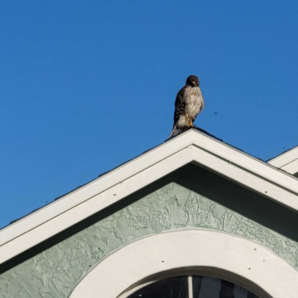 This morning, the weather was so perfect, I was out the door for a brisk walk as soon as the sun came up. At one point, I was startled by a hawk that flew directly into my path less than two sidewalk squares in front of me, flapping as it landed, facing me directly. I stopped short, figuring it would take off immediately , but it didn’t. It sat there, looking right at me, and I stood still looking directly into its eyes. I tried not to move too much, but wanted to get a picture, so I was quietly turning on my phone camera. It kept sitting there staring at me. I almost took the picture when someone from the house came out of their front door and it took off. I saw it fly up to the roof of a house directly across the street. It perched there and seemed to continue looking right at me as I took picture after picture. I could feel its confident strength, and it gave me the chills. I stayed there for a while, but eventually started walking down the street slowly, turning, and then walking back. It never moved.