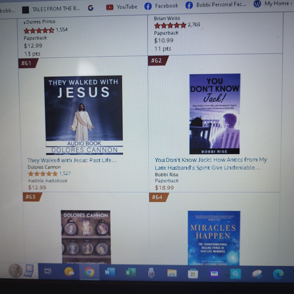 Yesterday, my publisher pointed out that on the Amazon page of book ratings, my/our book about Jack’s Spirit’s communications made #62 on the Amazon ratings. The day before was #37, so both days in the top 100! Amazon ranks by category, I am learning, and as we work on establihing those most closely matching my content, they just grouped our book with other spiritually similar books, but specifically in the category of “reincarnation.” My intent, however, was to show how our consciousness continues, and we don’t die when the physical body comes to its end. However, for some who see the spiritual categories as pretty much all in the same general genre, it worked for me so that Jack’s story could make it to best seller list two days in a row!