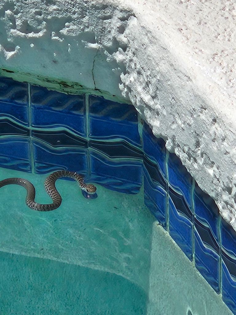 To this minute, I can’t say how I exited the pool except to wonder if I flew. The panic from thinking it was a diamondback poisonous rattler within arm’s length left me shaky. I also pictured it getting out of the pool and continuing to be a threat. That made me grab my phone from a distance to take a zoomed-in picture immediately so I could identify it if it bit me. Needless to say, I then left the area in a hurry to get into my house and get the door closed tightly and locked! I figured if it ever got into my house, I would simply have to move out!