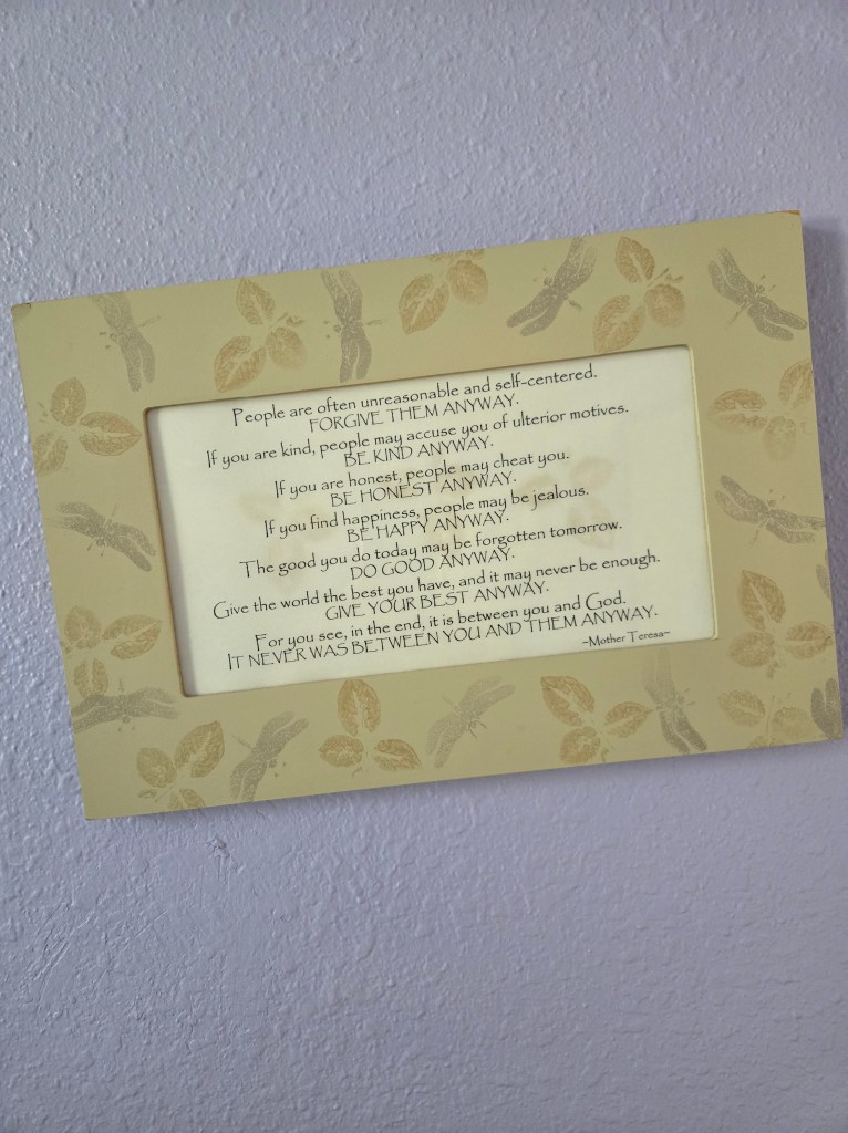 I mentally asked my late husband, Jack, if he could give me a sign indicating which one he would have me choose. As I did, I happen to look up at a crooked picture hanging on the wall. There was no open window, no breeze, no one else home, and no explanation as to why it was so tilted. It has never been crooked and has been hanging there straight for over a decade. No surprise, it was Mother’s Teresa’s quote right when I needed it. I have no idea how it happened, but if it was a sign from my late husband’s energetic spirit, I got the message. Kindness always wins so I would go with my heart. The struggling young man deserved a break, and down the road, he could pass it forward from there.