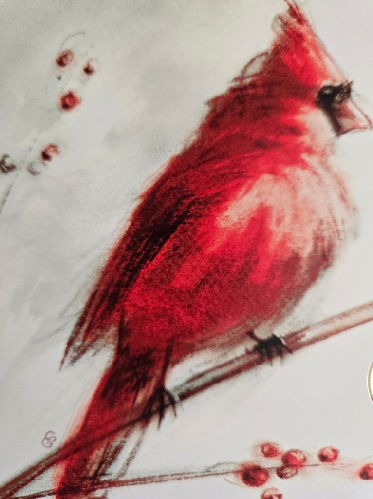 I was in a Hallmark store browsing through rows and rows of shelves of boxed Christmas cards on a newly set-up display, reading one after the other and not impressed by any. I mentally talked to my late husband wishing he could help me find a card so I could feel like it was from him, too. As I did, a box tipped off the very bottom shelf of the display rack, tipping off and landing to rest on the toe of my right shoe. I was startled at first, as I looked down to see how that could have happened since no boxes were sticking out, and I hadn’t moved for quite a while…maybe five full minutes or so. As I picked up the box to return it to the shelf, I saw that it had a picture of a red cardinal sketched on the card inside. In all honesty, I was not that impressed by the card and began to put it back and walk away. However, I suddenly remembered a red cardinal is a well-known symbol from loved ones who have passed on. A big smile spread across my face as I felt his energy with me. That’s when I realized he just had his input for “our” card this year. I’ll know now, it will be from me and his loving spirit.